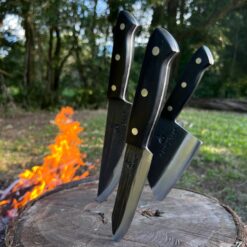 This quality set of 3 stainless steel (3Cr13) food preparation knives is compact and can be easily stowed. The canvas knife roll, with sewn pockets for all of the contents, and Velcro closure, keeps everything safely contained in the one place Each knife comes with a unique protective cover. There is also a handy sharpening tool included in the set.
