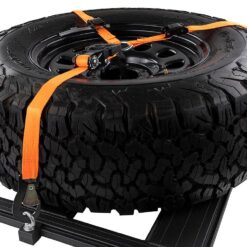 Wheel Y-Strap with snap lock style hooks to improve on some features of existing wheel straps in the market. Design features include a tether strap and snap lock hooks, which in combination positively retain the spare wheel and tyre even in the event of the spare wheel deflating. The tether strap also improves retaining of a tyre carcass only. Snap hooks work conveniently with ARB BASE Rack Eye Bolt Tie-Downs (not included part number – 1780200), or other aftermarket eyelets.