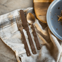 Breng iets nieuws op tafel. Deze unieke bestekset is strak en eigentijds en veelzijdig genoeg om te gebruiken voor kamperen in de auto, rustieke barbecues of als extra servies voor een verfijnd diner thuis. (Het mes is scherp genoeg om een biefstuk te snijden!)