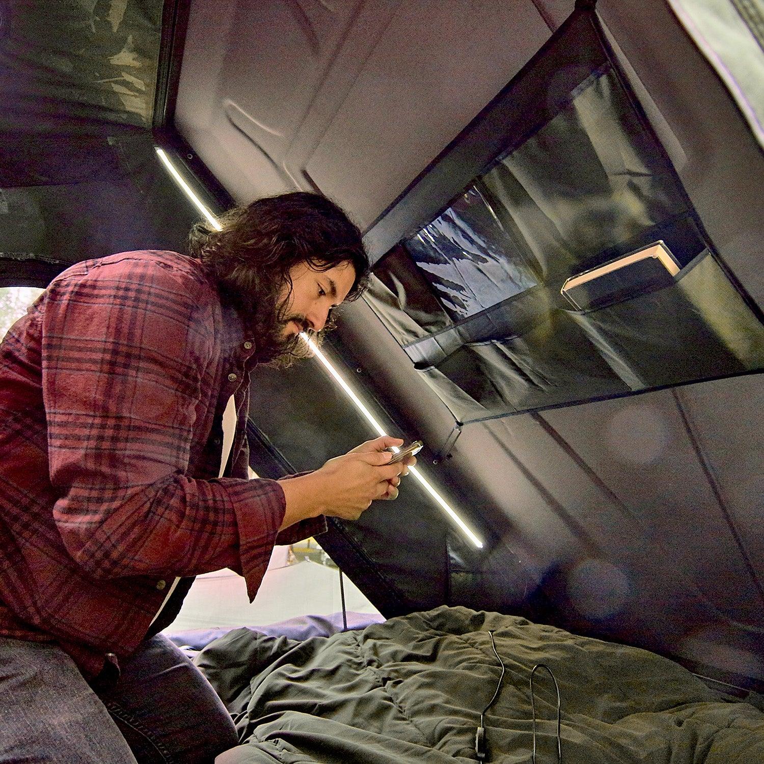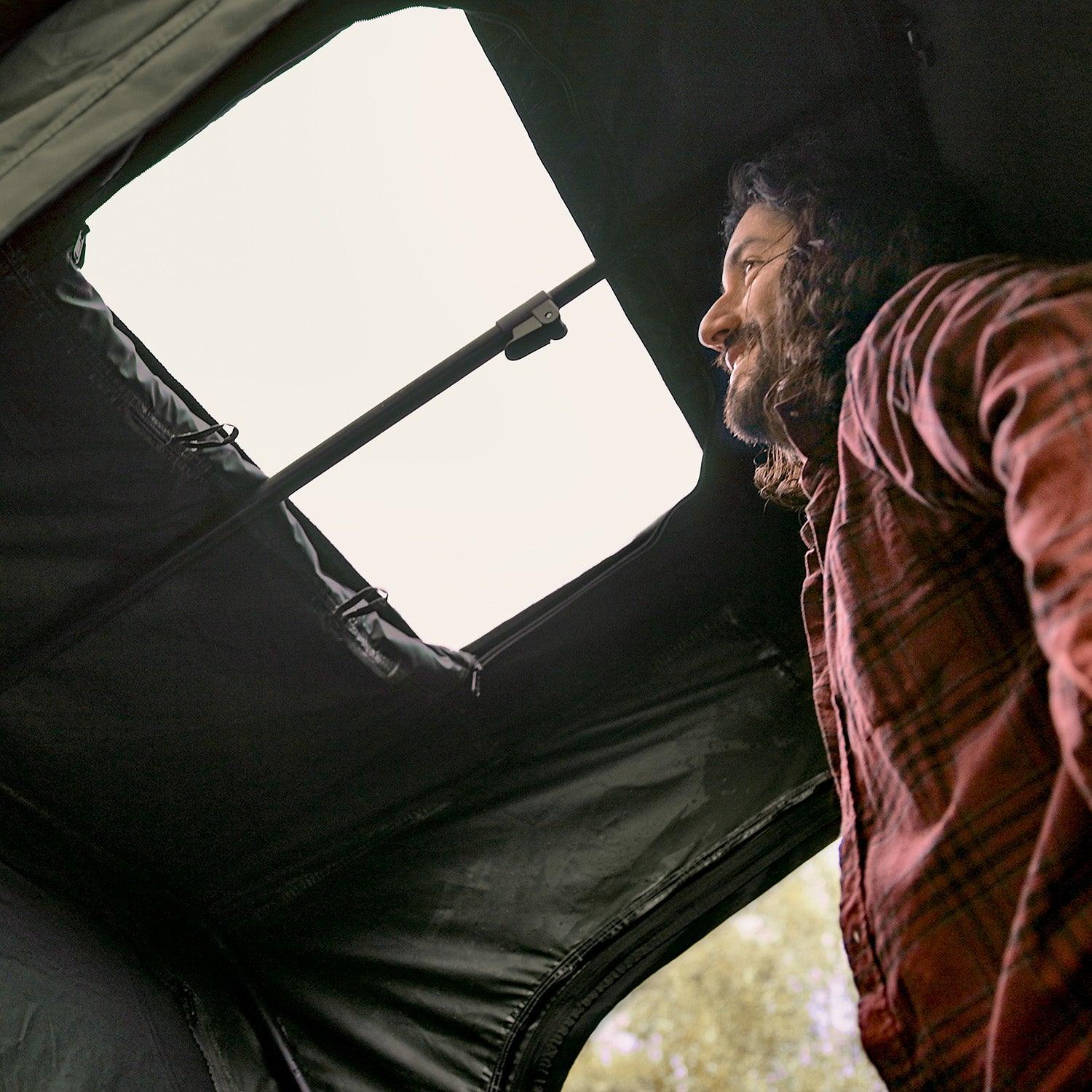 The Ridgeback body tent is made from ecoWGAF™ – 280gsm Polyester Oxford Ripstop / 100% Recycled RPET fabric. This tent has an impressive 3000mm water rating, high profile automotive rubber weather seals, internal seam sealing and a removable fly that will keep you dry in extended rainy conditions.