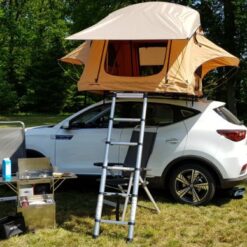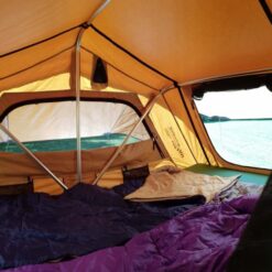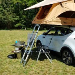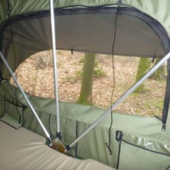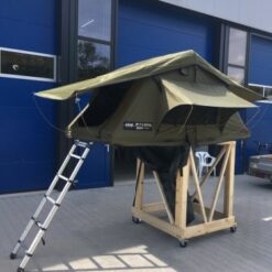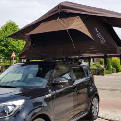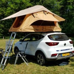 Deze softtop daktent is eenvoudig en snel op te zetten. Door de vele ramen is er veel licht. Daarnaast hebben de ramen ook een blinderingsoptie. Deze zorgt ervoor dat u ook overdag een goede slaapomgeving kan creëren. Omdat de daktent bovenop uw auto staat, heeft u ook ruim uitzicht. We kunnen de daktent leveren in de kleuren groen, bruin of zand. De ingang is voorzien van een luifel en een telescopische ladder.