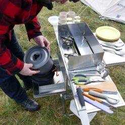 De kookkist S heeft, in tegenstelling tot de M, twee branders die in de kookkist vast zitten. U kunt ze dus niet los van de kookkist gebruiken. Het voordeel is daardoor wel dat ze stabiel staan, zeker met een wat zwaardere pan. Het ruime werkblad heeft een hoogte van maximaal 60cm. Heeft u liever wat grotere pannen of een geïntegreerde tafel met een hoogte van 68cm zoals de normale camping tafels, kies dan voor de Dare To Be Different kookkist M.