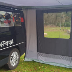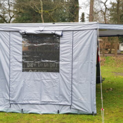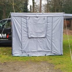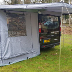 Standaard wordt de luifel met de 2,5 meter brede voorwand geleverd. Deze kan met klittenband aan de luifel worden gehangen. Als opties leveren wij wanden van 2,15 meter. Met deze wanden is een rondom afsluitbare voortent te maken. Alle wanden zijn voorzien van PVC-ramen en horrengaas-deuren.