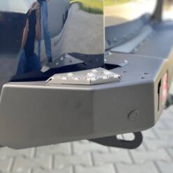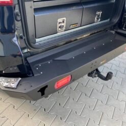 Korte achterbumper met verlichting, speciaal voor TOYOTA LAND CRUISER KDJ150 13-17 – . De hoofdstructuur van de bumper is gemaakt van 3 mm dik S700-plaatwerk en de framebevestigingen zijn gemaakt van 5 mm dik plaatmetaal . Het product wordt eerst met een laser gesneden, vervolgens op een CNC-kantbank gebogen en tijdens de handmatige afwerking wordt de juiste vorm verkregen . De volgende fase is de anti-corrosiebescherming bestaande uit het aanbrengen van een zinkpoederprimer en poedercoating , waardoor de bumper zijn definitieve uiterlijk krijgt.
