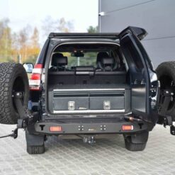 Lange achterbumper met verlichting, speciaal voor TOYOTA LAND CRUISER KDJ150 13-17 – . De hoofdstructuur van de bumper is gemaakt van 3 mm dik S700-plaatwerk en de framebevestigingen zijn gemaakt van 5 mm dik plaatmetaal . Het product wordt eerst met een laser gesneden, vervolgens op een CNC-kantbank gebogen en tijdens de handmatige afwerking wordt de juiste vorm verkregen . De volgende fase is de anti-corrosiebescherming bestaande uit het aanbrengen van een zinkpoederprimer en poedercoating , waardoor de bumper zijn definitieve uiterlijk krijgt.