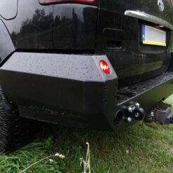 Achterbumper, speciaal voor TOYOTA LAND CRUISER 120 Serie LWB . De structuur van de bumper is gemaakt van 4 mm dik staal en de bevestigingen aan het frame zijn 5 mm dik . Het product wordt eerst met een laser gesneden, vervolgens gebogen op een CNC-afkantpers en tijdens handmatige afwerking wordt de juiste vorm verkregen . De volgende fase is de anticorrosiebescherming , bestaande uit het aanbrengen van een zinkpoederprimer en poedercoating die de bumper zijn uiteindelijke uiterlijk geeft.