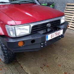 Voorbumper met een lierplaat en optionele afneembare bullbar opgedragen aan de TOYOTA HILUX 98-05 auto . De structuur van de bumper is gemaakt van 3 mm dik staal en de bevestigingen aan het frame zijn 5 mm dik . Het product wordt eerst met een laser gesneden, vervolgens gebogen op een CNC-afkantpers en tijdens handmatige afwerking wordt de juiste vorm verkregen . De volgende fase is de anticorrosiebescherming , bestaande uit het aanbrengen van een zinkpoederprimer en poedercoating die de bumper zijn uiteindelijke uiterlijk geeft.