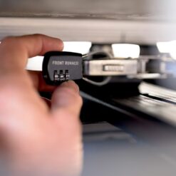 Wordt op zijn plaats bevestigd met 4 vergrendelingen met veiligheidspallen. Kan worden vergrendeld met een combinatiekabelslot van Cijfercombinatieslot voor accessoires op bagagerek/ Small – Front Runner.