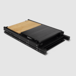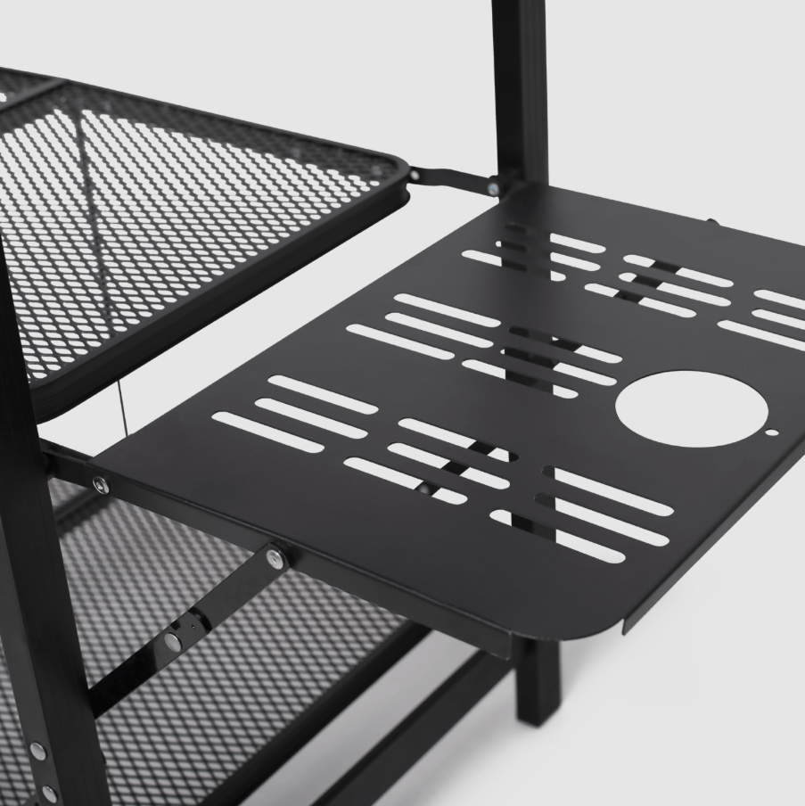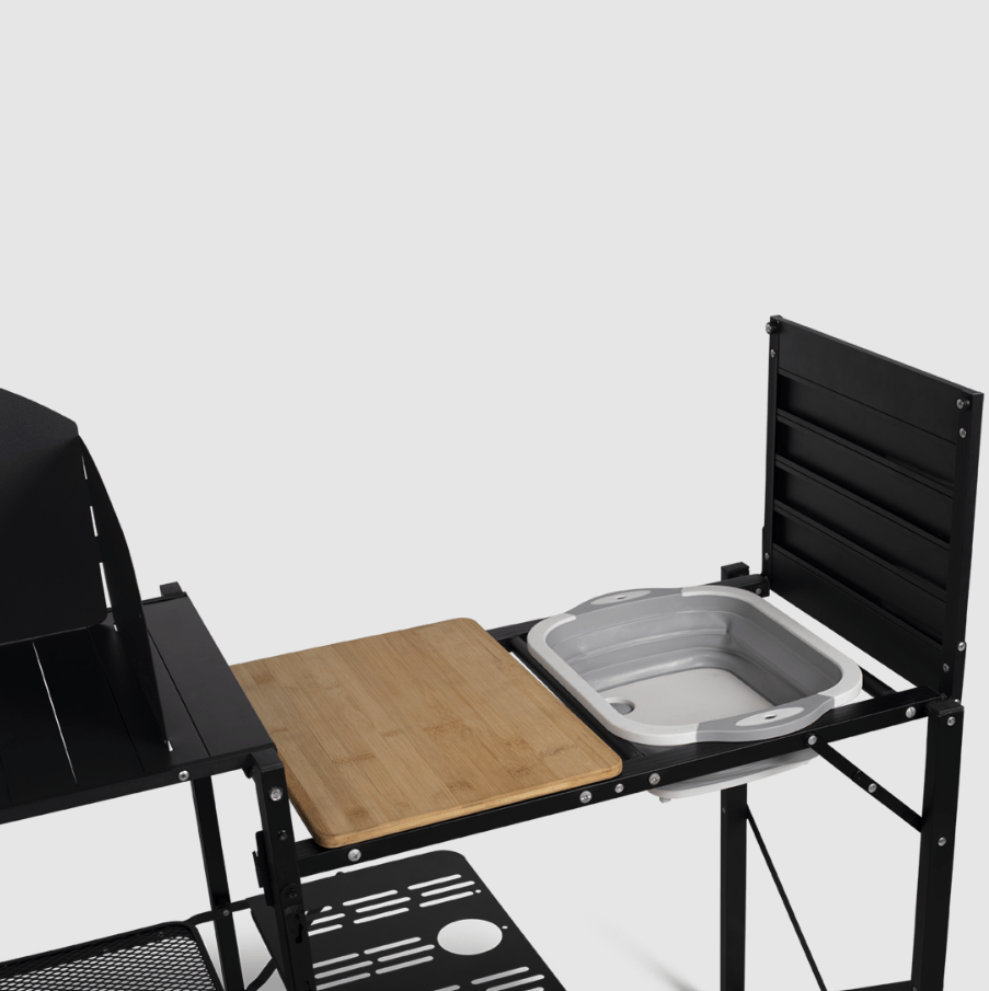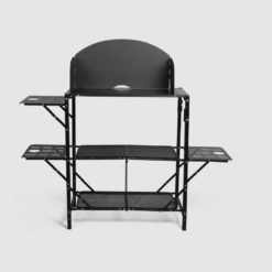 Iedere kampeerder verdient een eigen buitenkeuken, en de Slimchef biedt die. Deze slimme standaard houdt je kooktoestel stabiel en dient tegelijkertijd als werkblad en serveerstation. Lichtgewicht genoeg om mee te nemen, sterk genoeg om je meest ambitieuze boven kampvuur gemaakte creaties aan te kunnen.
