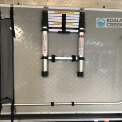 Bovenop de ingeklapte daktent is links en rechts naaste de ladder (onder de cover)