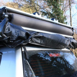 - De zwarte cover kun je gemakkelijk oprollen en zo onder de daktent bodem laten hangen.