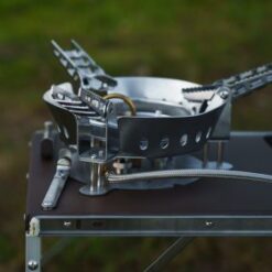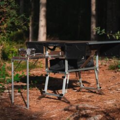 Het opzetten van de Chuck box is snel en eenvoudig dankzij de gasveren die de basis automatisch uitklappen zodra de zijkant open geklikt wordt. De Chuck box wordt standaard geleverd met een lege opbergtas die perfect in de kist past, ook als de Chuck box gesloten is. Deze opbergtas is ideaal voor het meenemen van uw favoriete kookgerei, bestek, specerijen, kruiden, kopjes en borden, zonder dat dit ten koste gaat van de extra laadruimte in uw voertuig of rugzak. Een ander opvallend kenmerk van de Chuck-box is de ingebouwde gaspit met hoog vermogen, die ook wordt geleverd met een windstopper die voorkomt dat de vlam uitblaast bij wind.