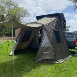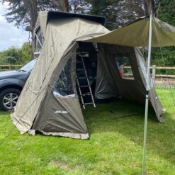 Deze voor-/ondertent zorgt voor extra leefruimte aan de zijkant van de auto. Past zowel op de Jimba Jimba Medium als Large en is in 2 kleuren verkrijgbaar, grijs en groen.
