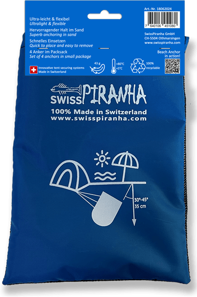 | Content | 4 x SwissPiranha BA Beach Anchors 1 x nylon bag with printed instructions |